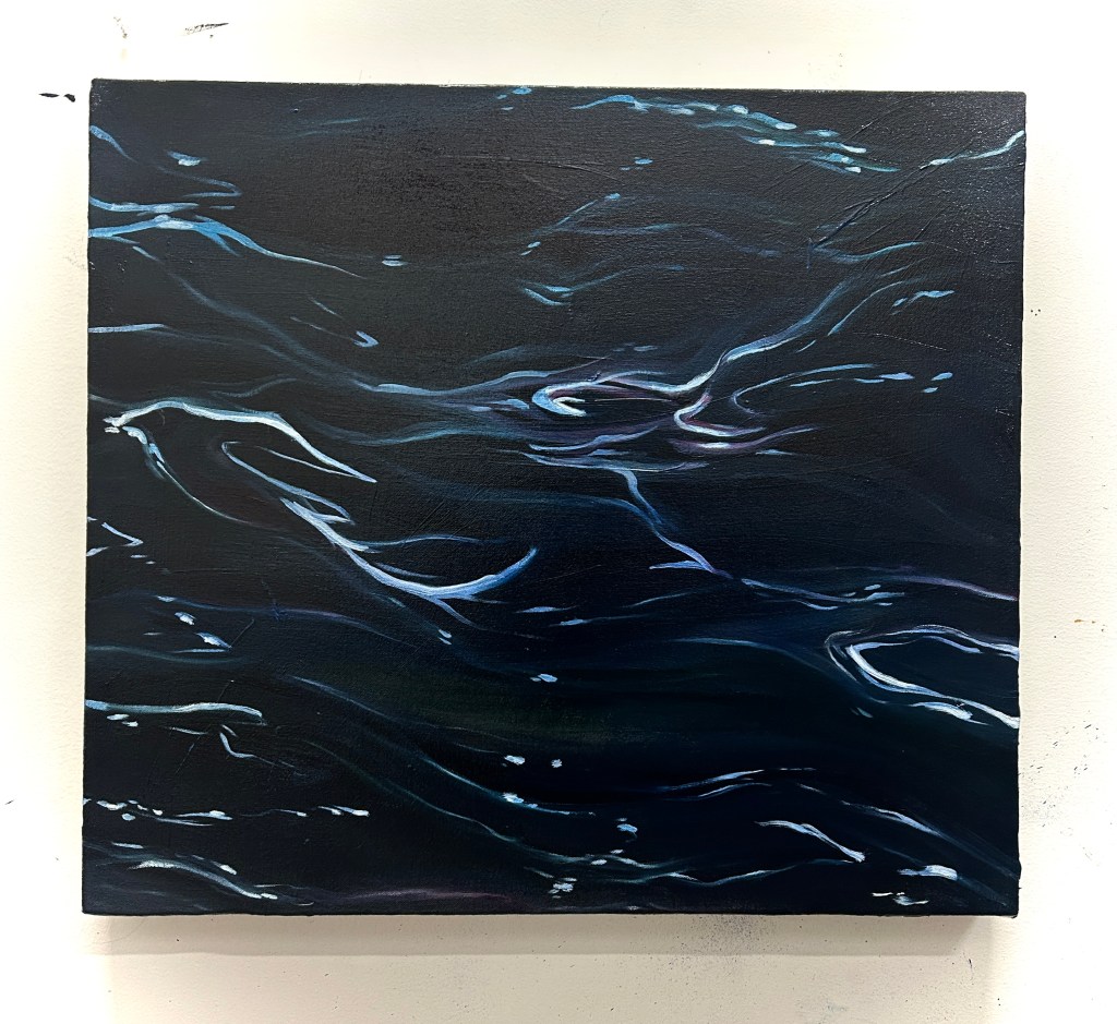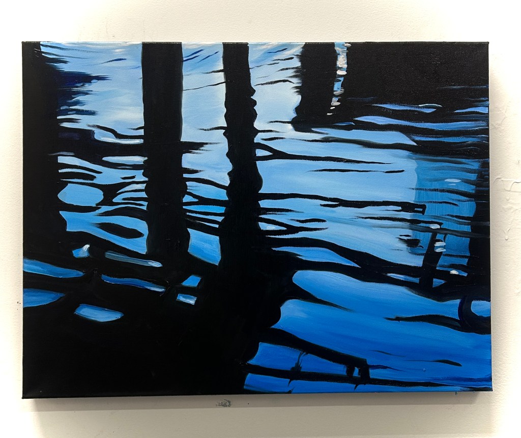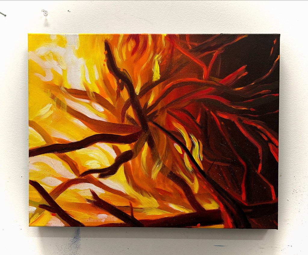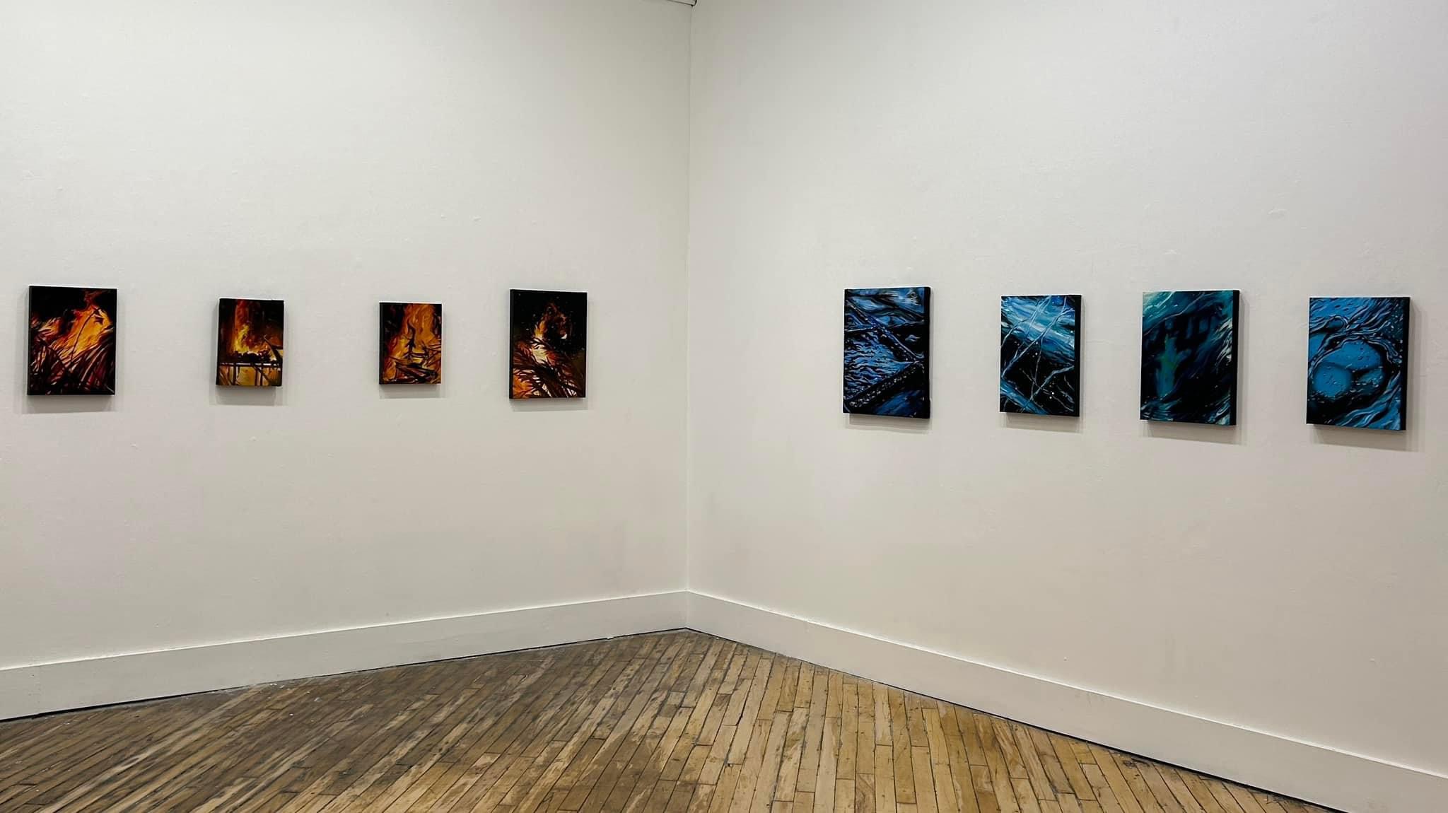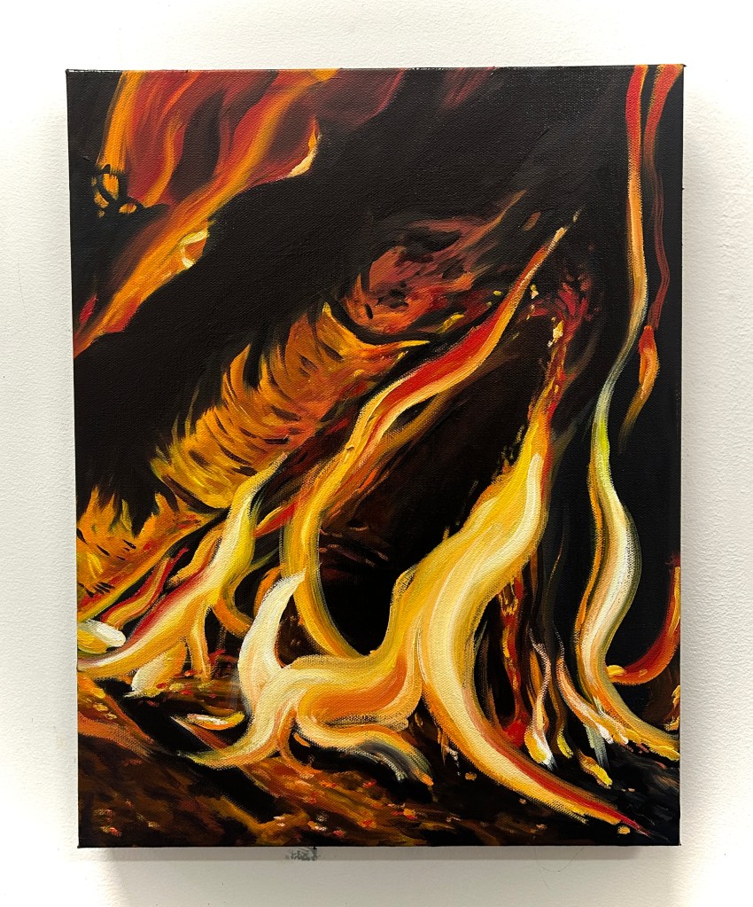 I am playing with fire, and drowning in swirling, dark waters at the same time. In this series I depict what has happened, what was survived, and what I feel we are trudging into. This series has emerged from my interest in painting light, darkness- abstract and real- Fire and Water. Water is the more abstract of the series, it flows from real to what may seem real (in the reflections) and in the unknown (the depths below). The Floods seem dangerous and disorienting as you wade through them, needing to move forward towards safety, but not knowing what awaits you within it.