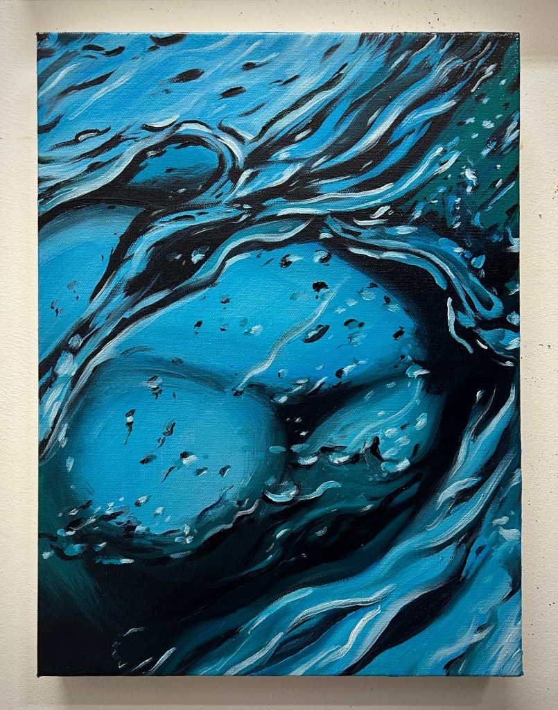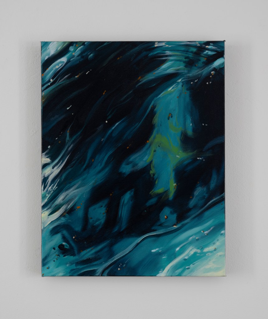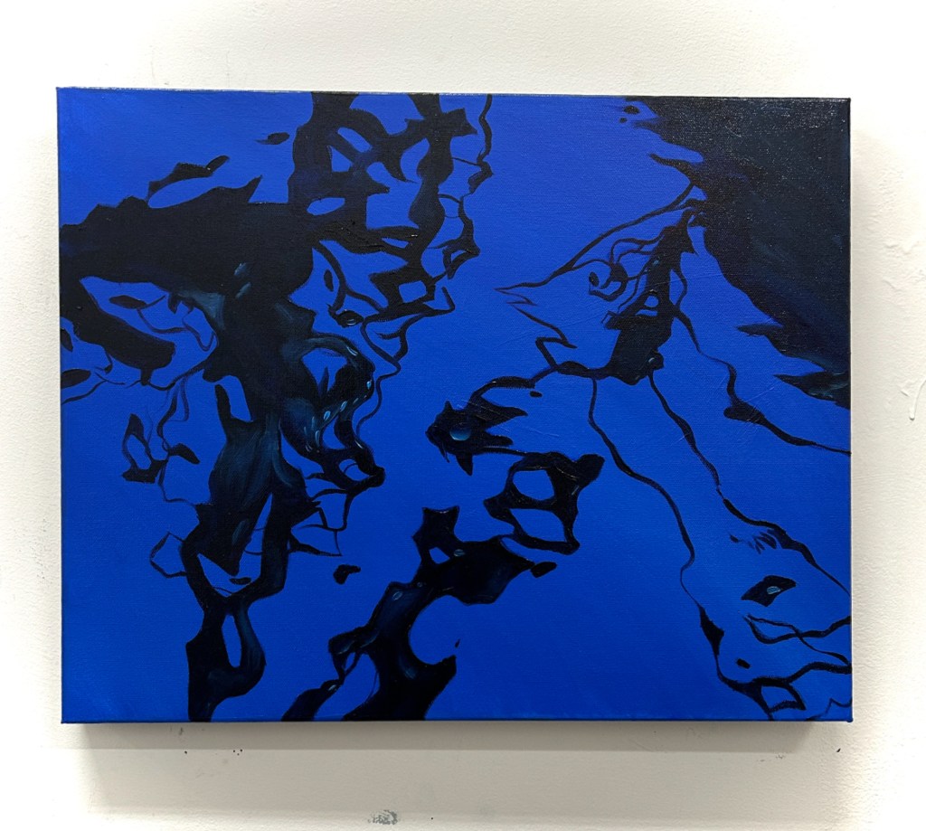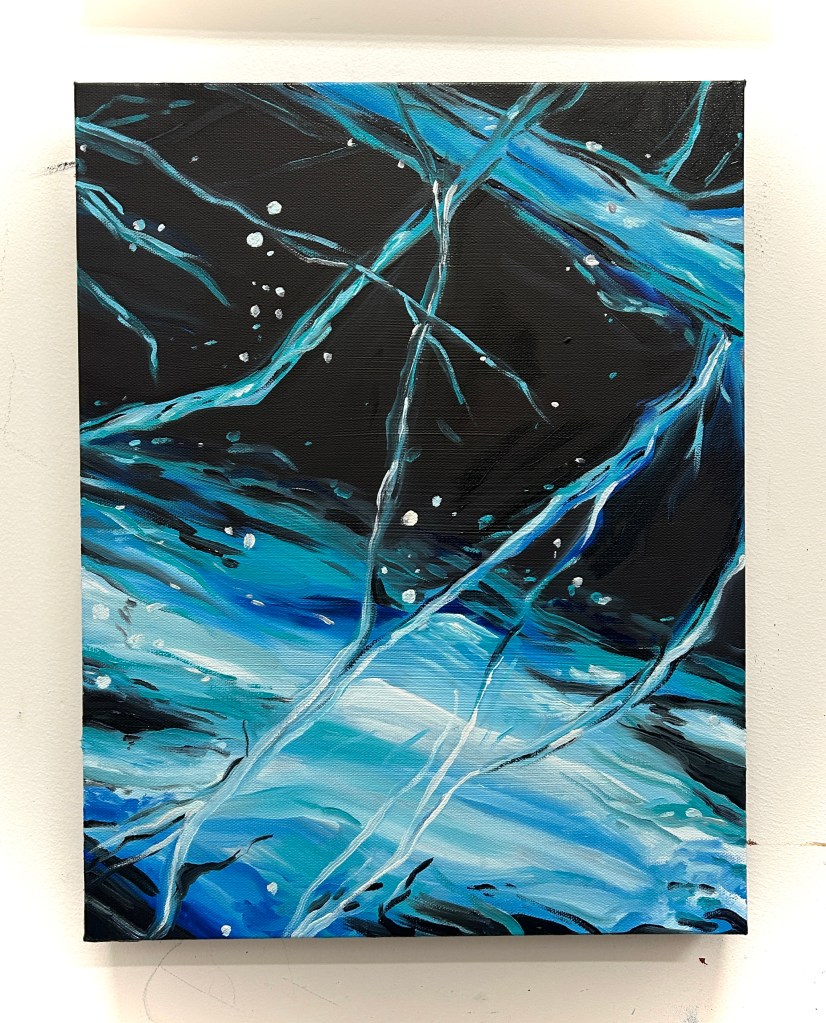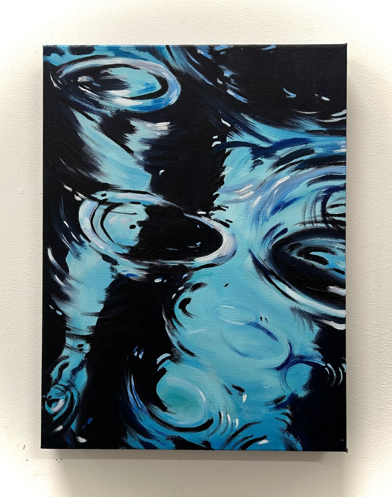 I am playing with fire, and drowning in swirling, dark waters at the same time. In this series I depict what has happened, what was survived, and what I feel we are trudging into. This series has emerged from my interest in painting light, darkness- abstract and real- Fire and Water. Water is the more abstract of the series, it flows from real to what may seem real (in the reflections) and in the unknown (the depths below). The Floods seem dangerous and disorienting as you wade through them, needing to move forward towards safety, but not knowing what awaits you within it.