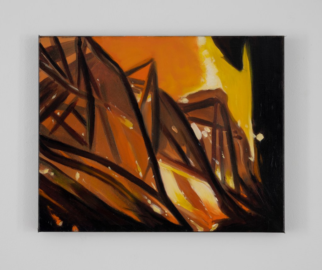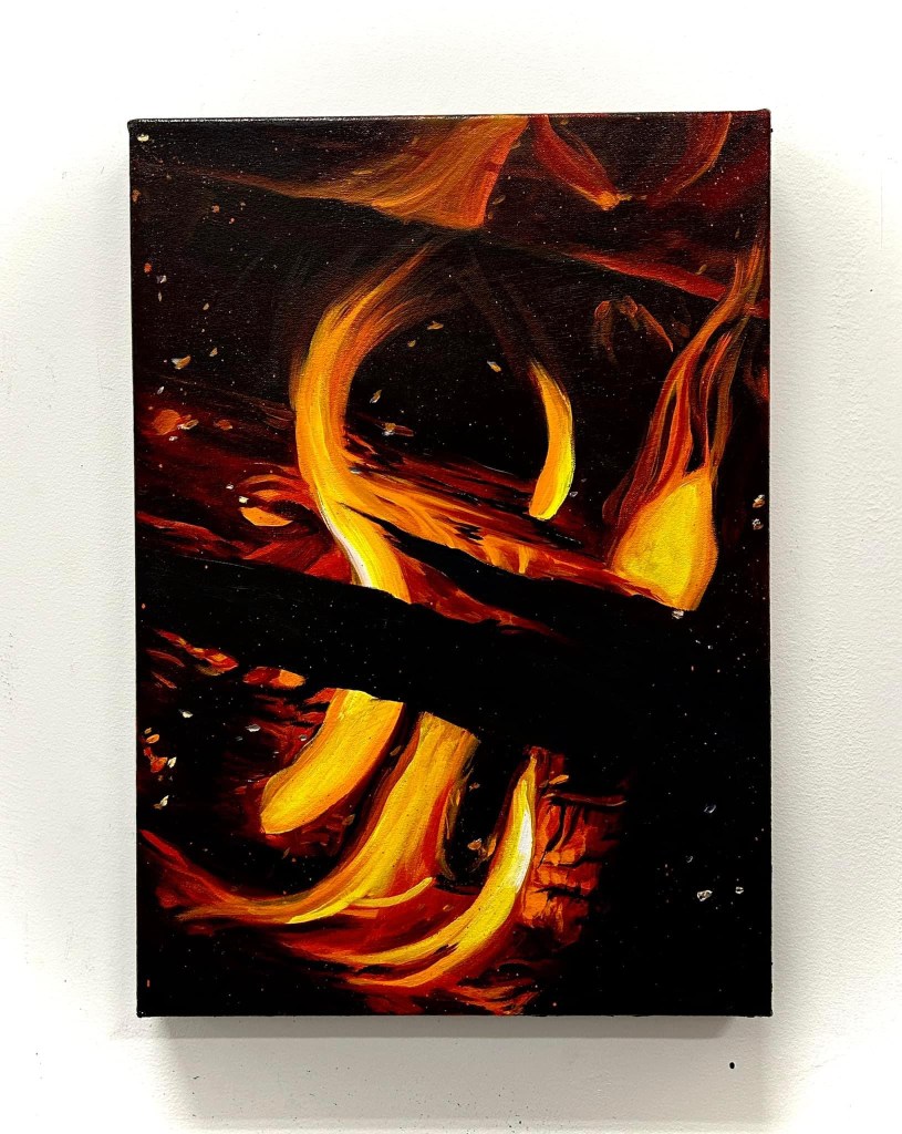 The Fires offer the only structure in the works, but those structures are broken down and left to interpretation, to recreation. In each fire piece, I leave Objects/Obstacles in the foreground, build a deeper mid ground, and create a more abstract dissipated background that falls apart at the flames, using both oil and spray paint. The fires are seductive, warm, and draw you in, and I use each piece to show scenes as if you are the one treading through a destroyed past and into an unknown future.